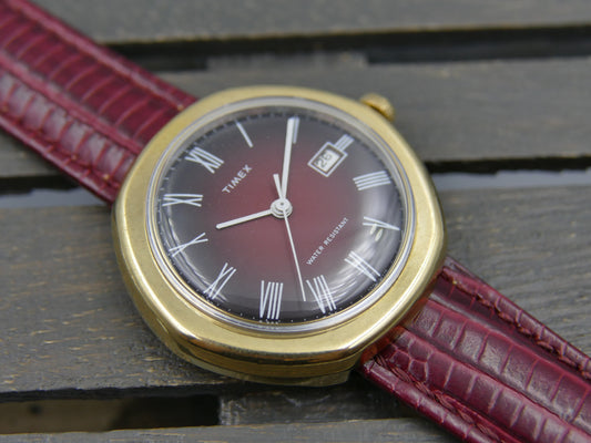 Vintage watch mens Timex hand wind burgundy gold pl