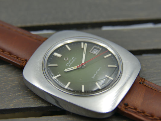 70's vintage watch mens Certina blue ribbon green dial rare big case steel 38mm