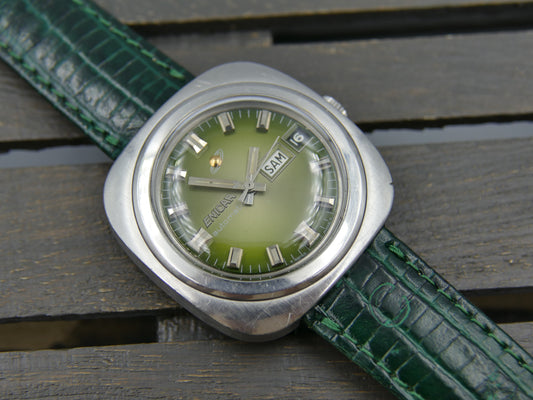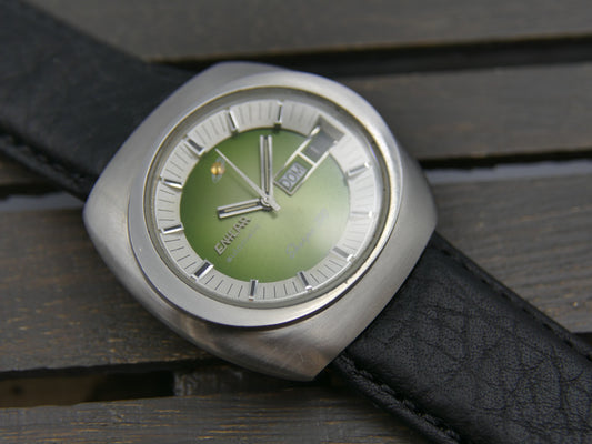 70s vintage watch mens Enicar ref 167-12-03 automatic day date 37mm green dial