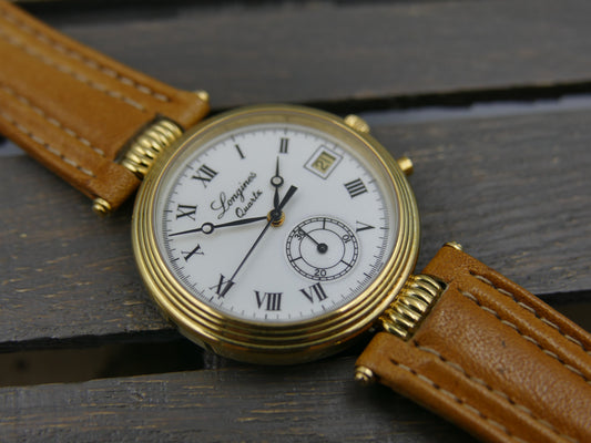 80s vintage watch mens Longines 150th Anniversary edition quartz chronograph monopusher mint