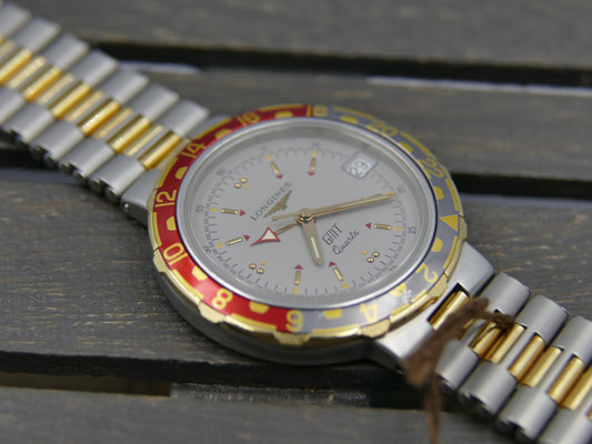 80s Vintage watch mens Longines ref 4995 Conquest GMT Quartz NOS