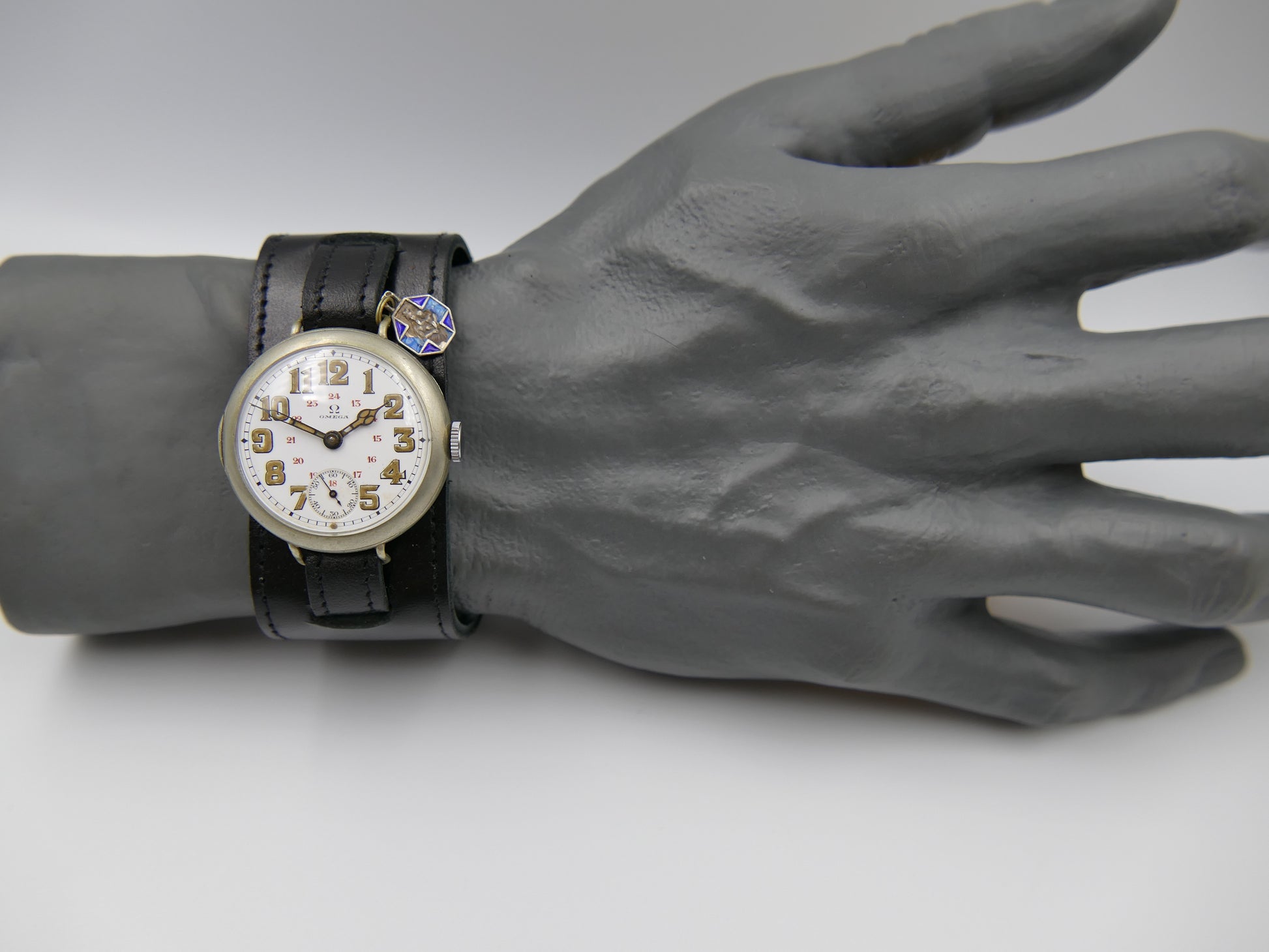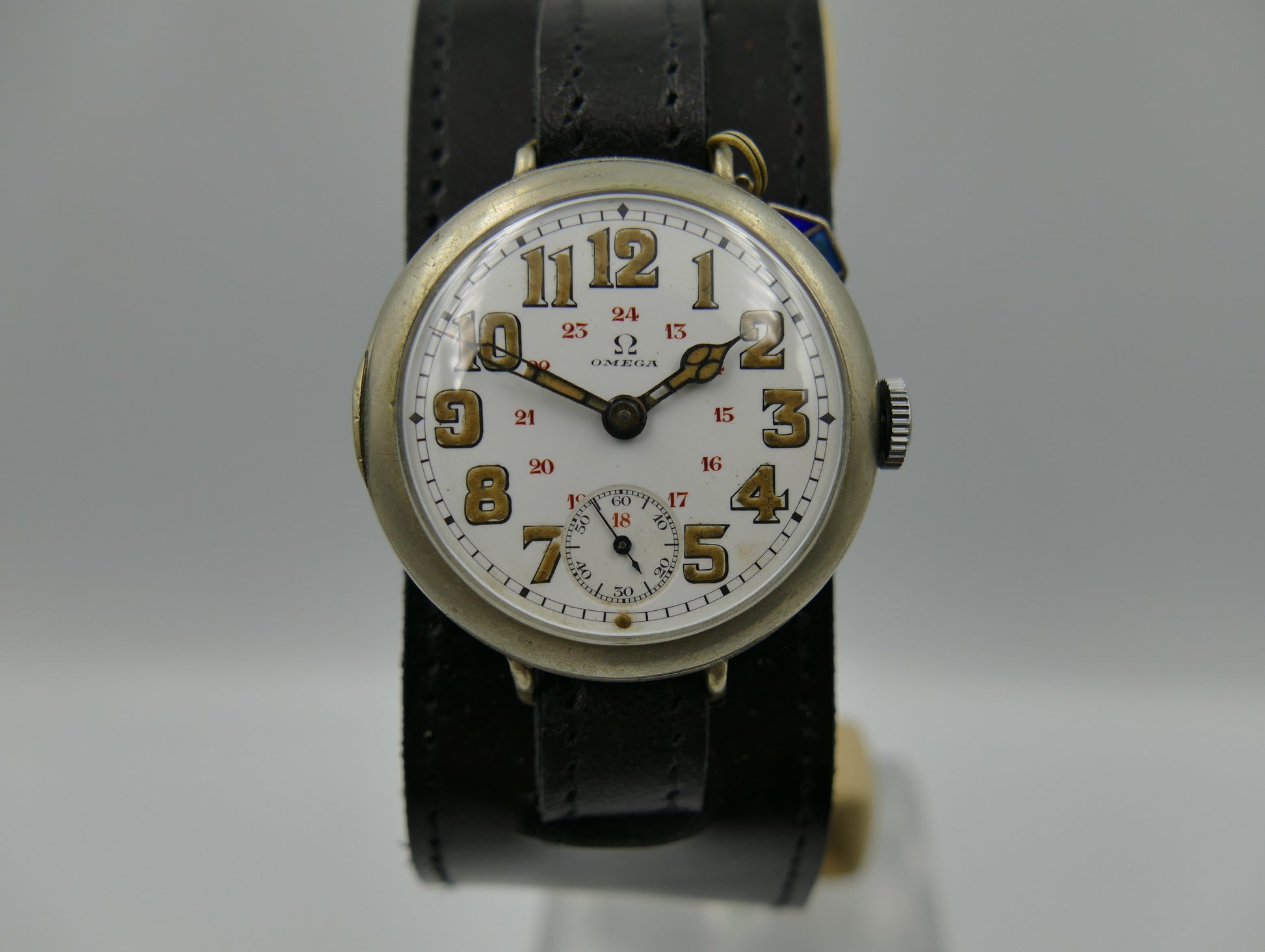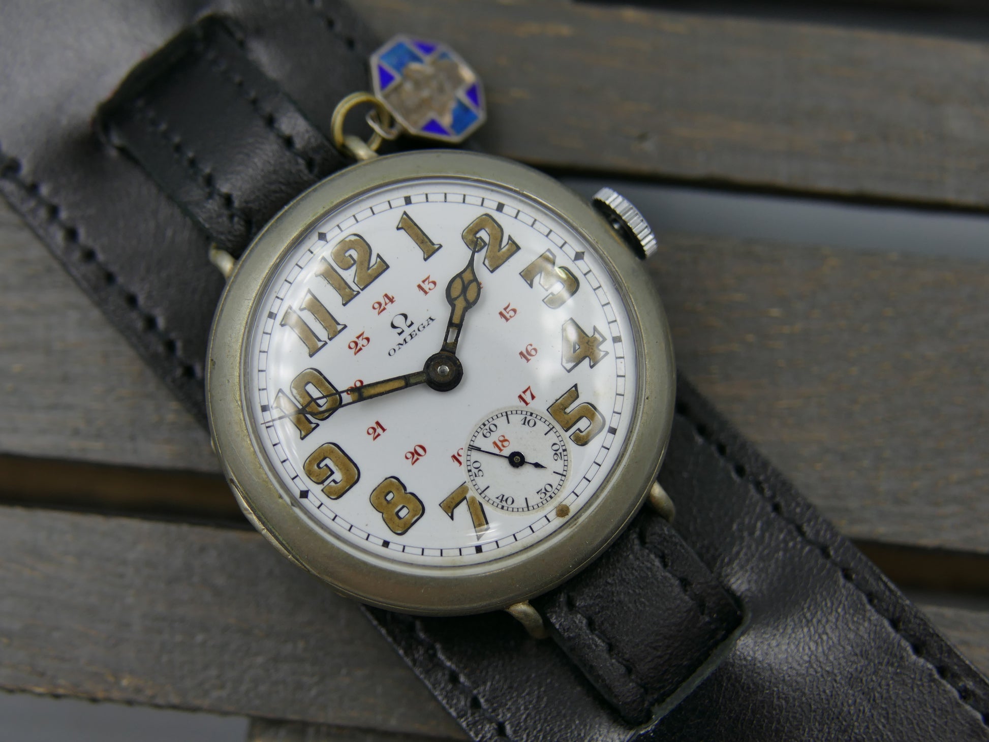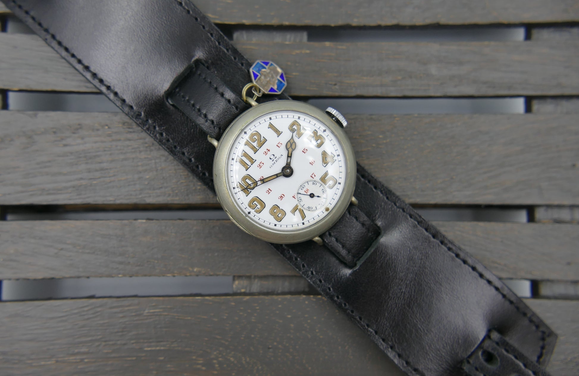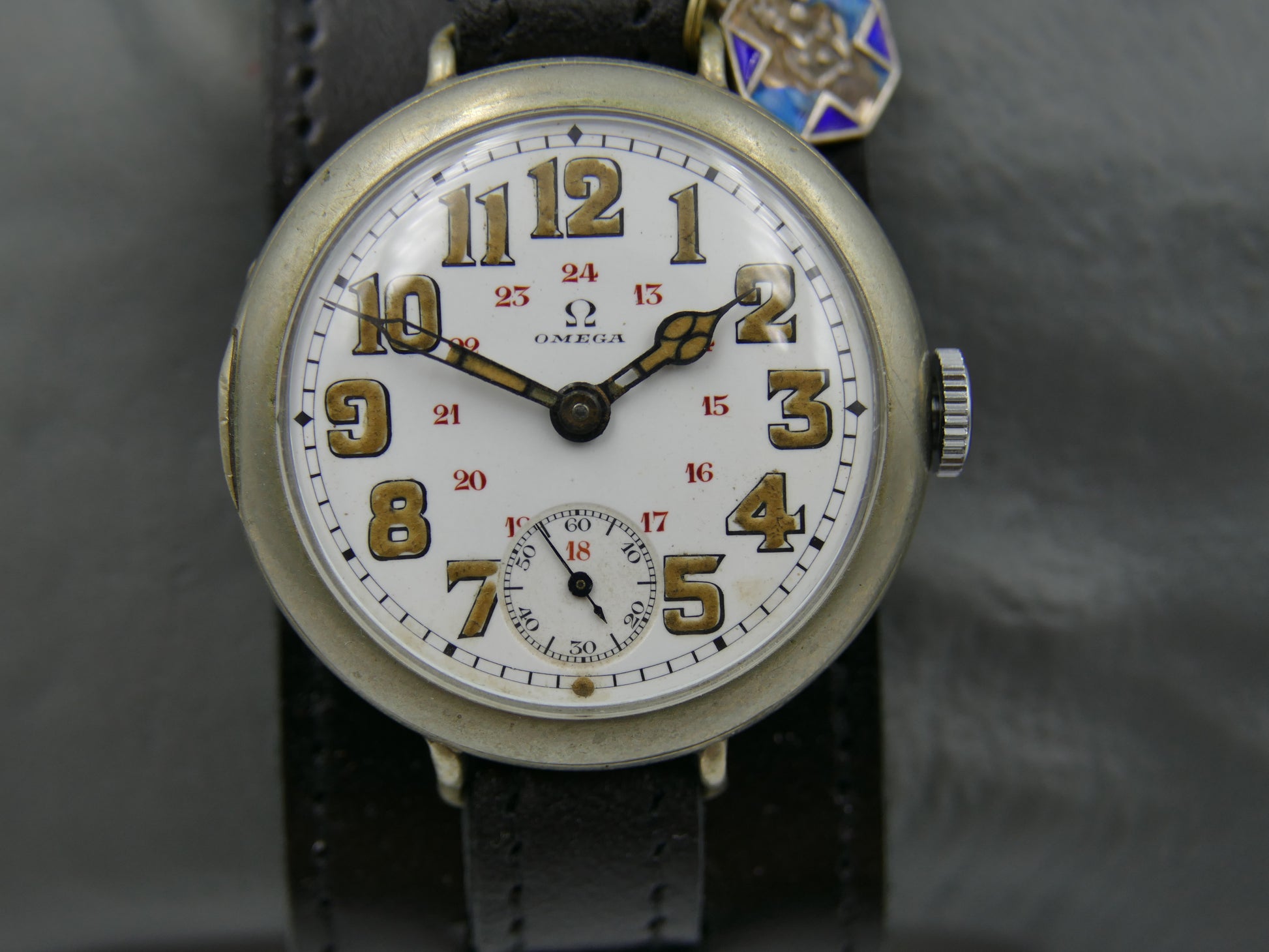 From the early 10's this WWI ERA this oversize/jumbo military officers Omega, manual wind movement cal. 13''' SOB, there is a blue enamel medal attached, probably from that era, recently serviced by watchmaker...