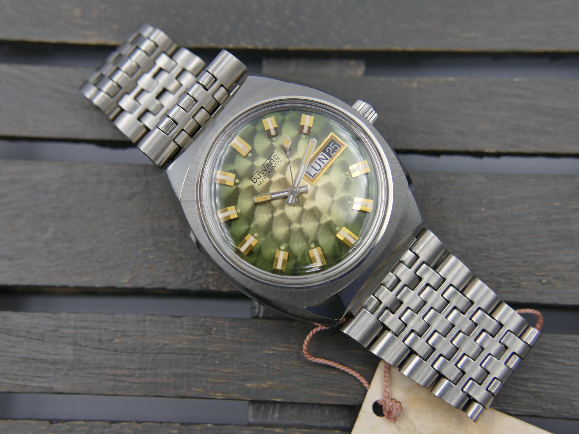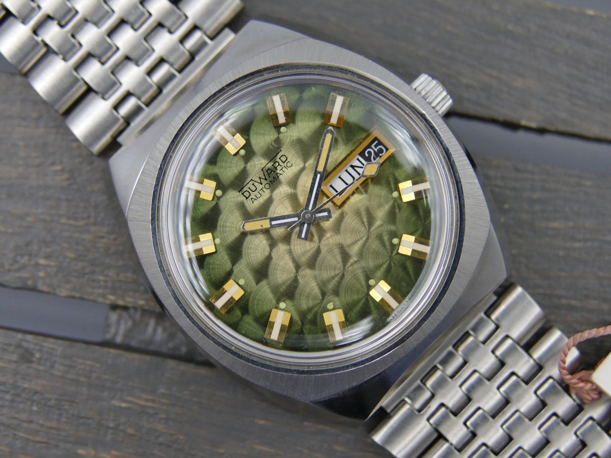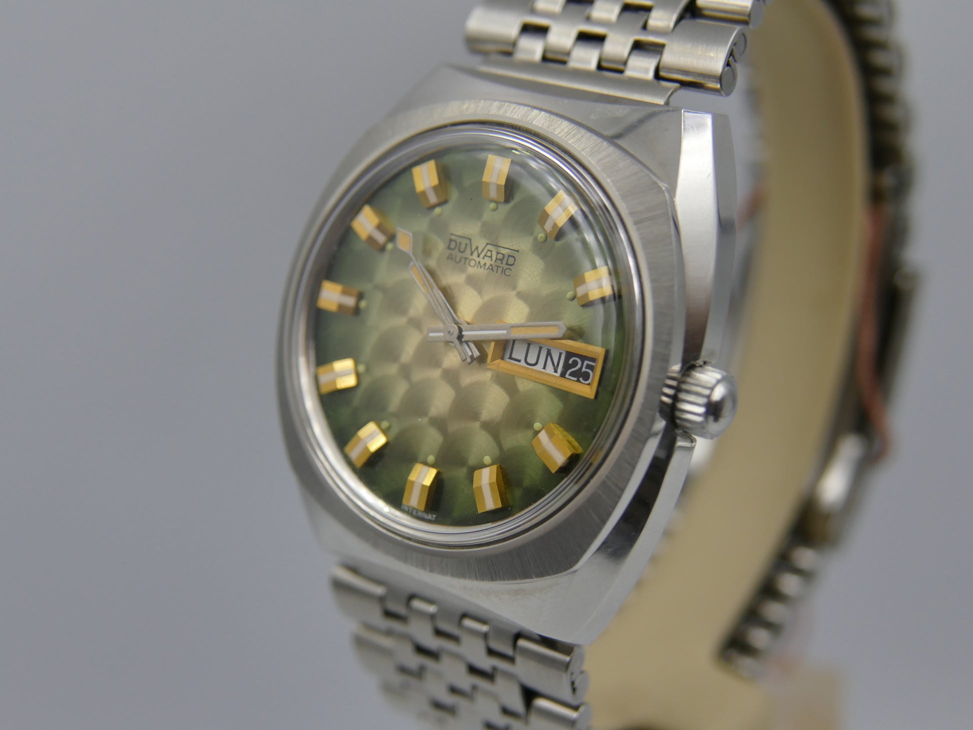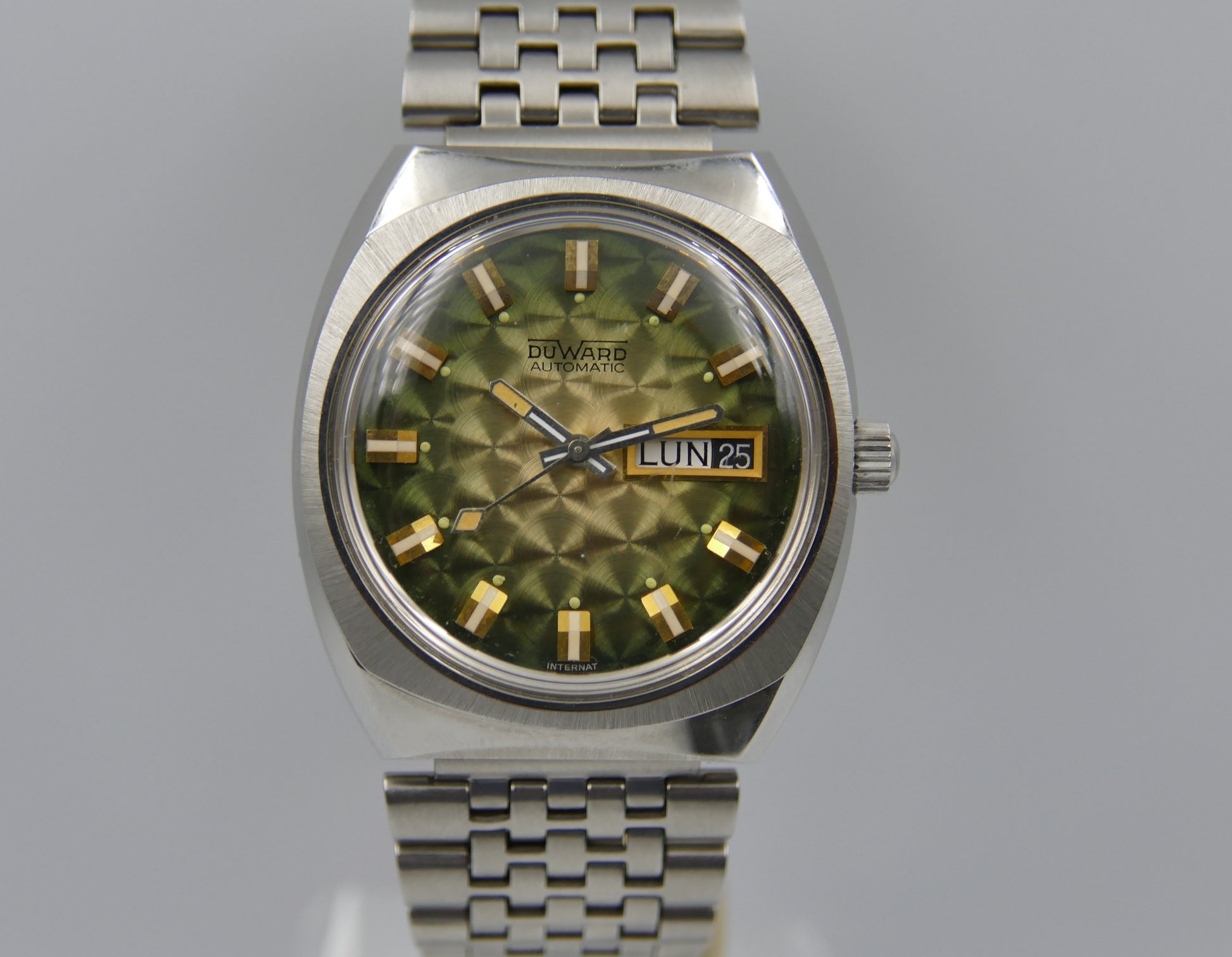 70s vintage watch DUWARD Automatic Cal. ETA 2789 Ref. 6002 green brushed circular dial NOS