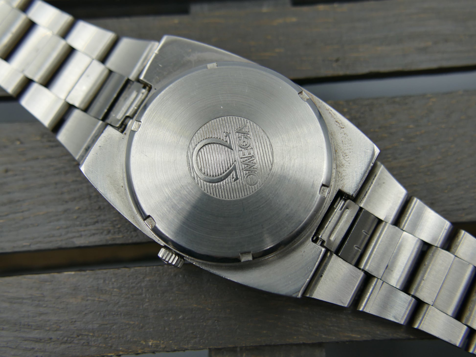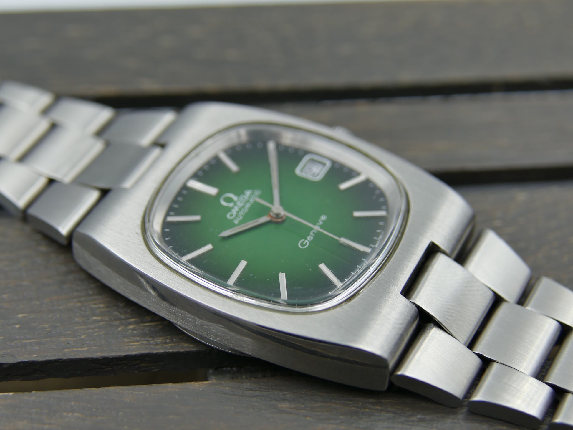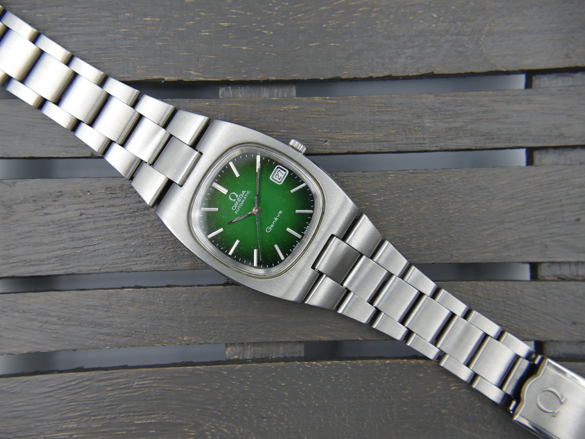 From 1973 this Omega Geneve Automatic ref. 166.0191 in stainless steel with integrated bracelet, green dial, working well....