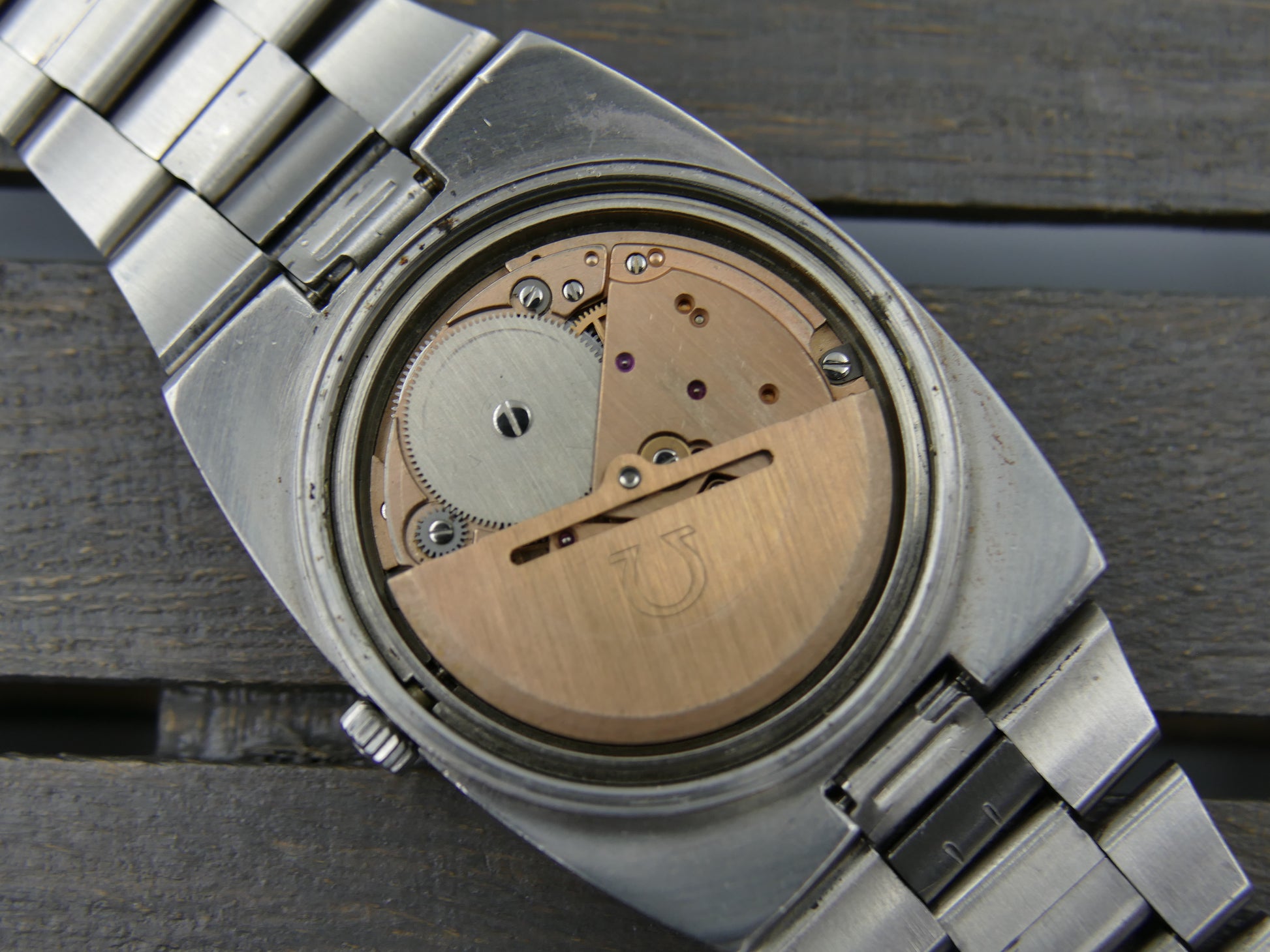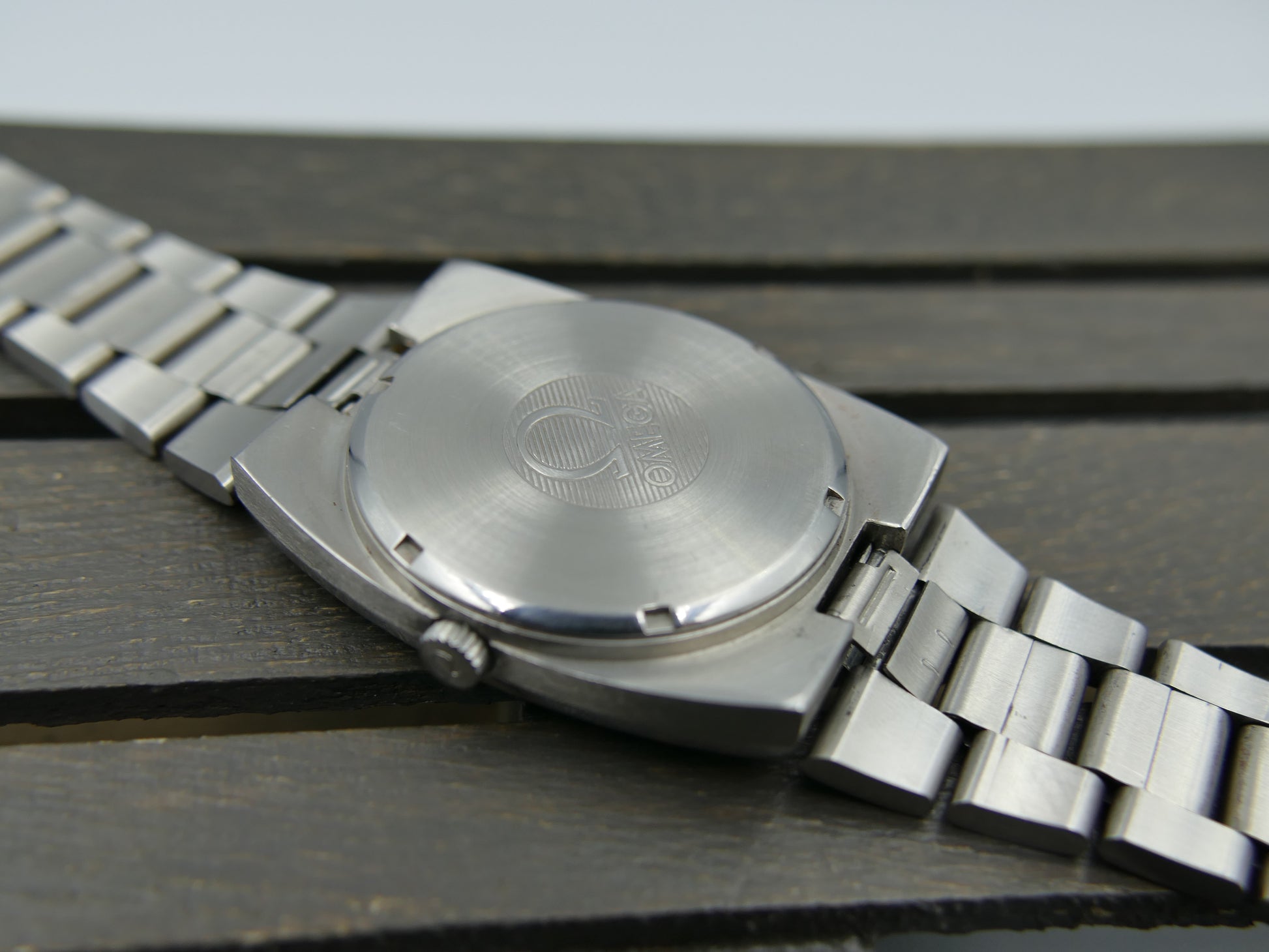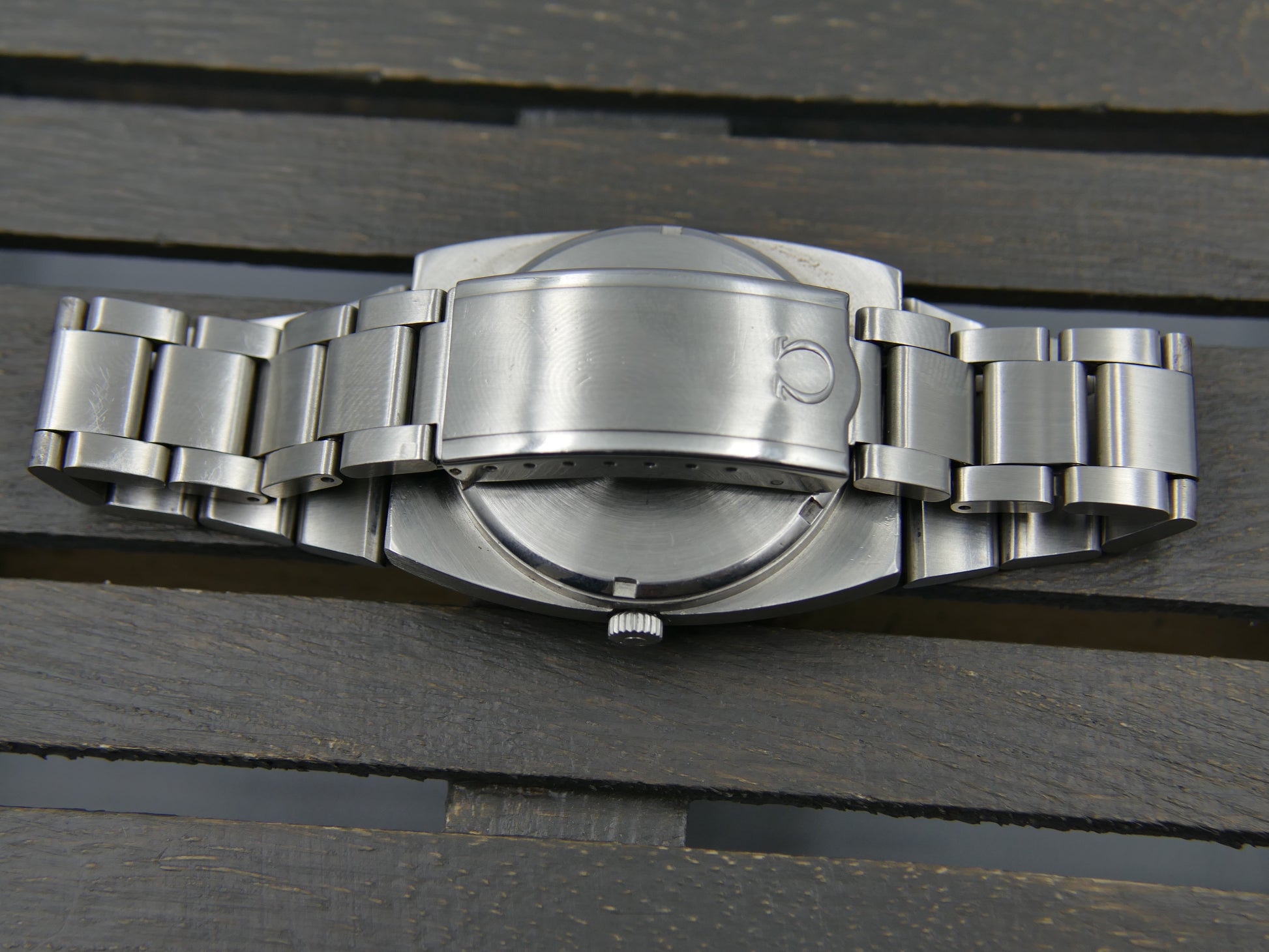 From 1973 this Omega Geneve Automatic ref. 166.0191 in stainless steel with integrated bracelet, green dial, working well....