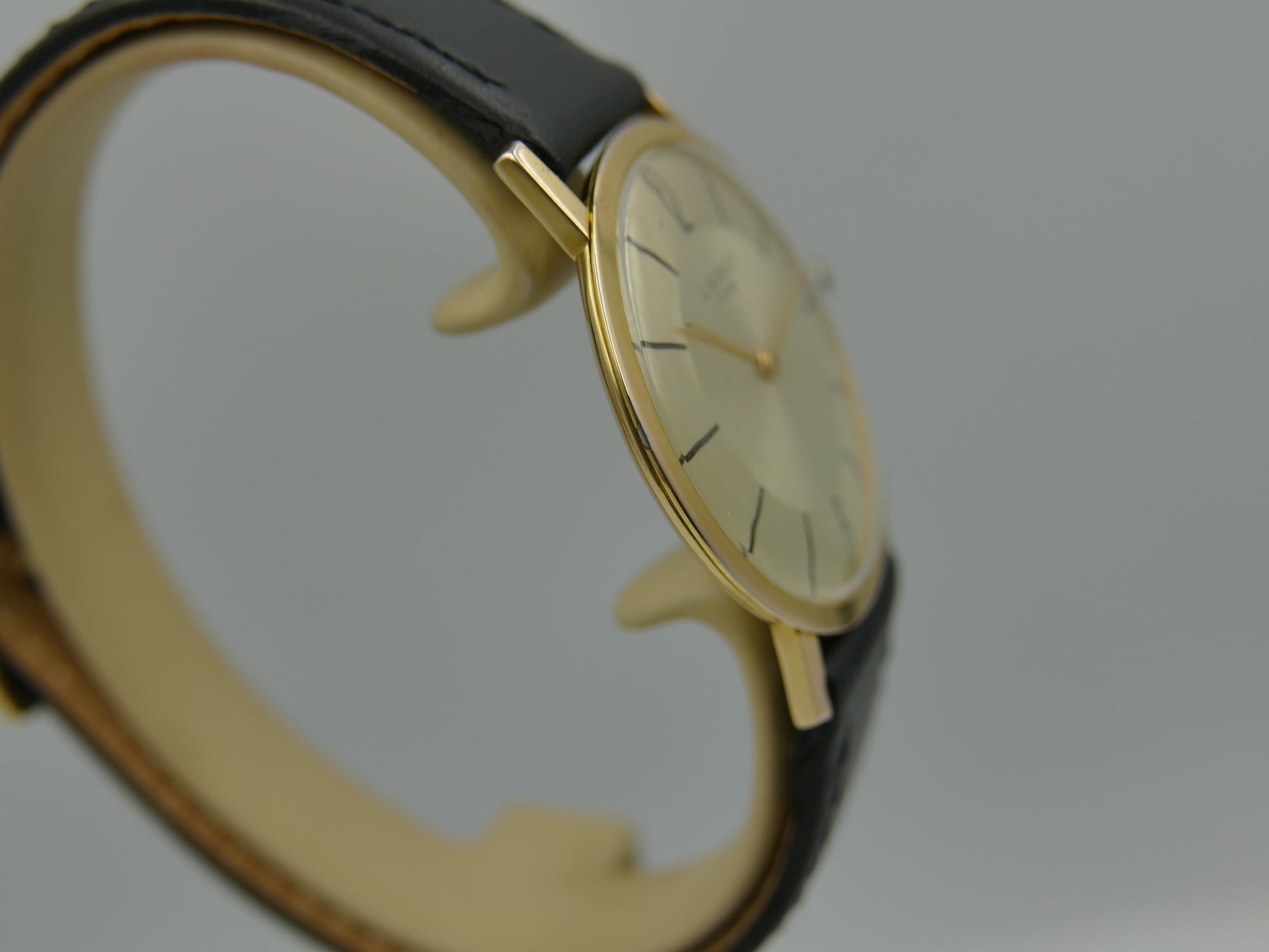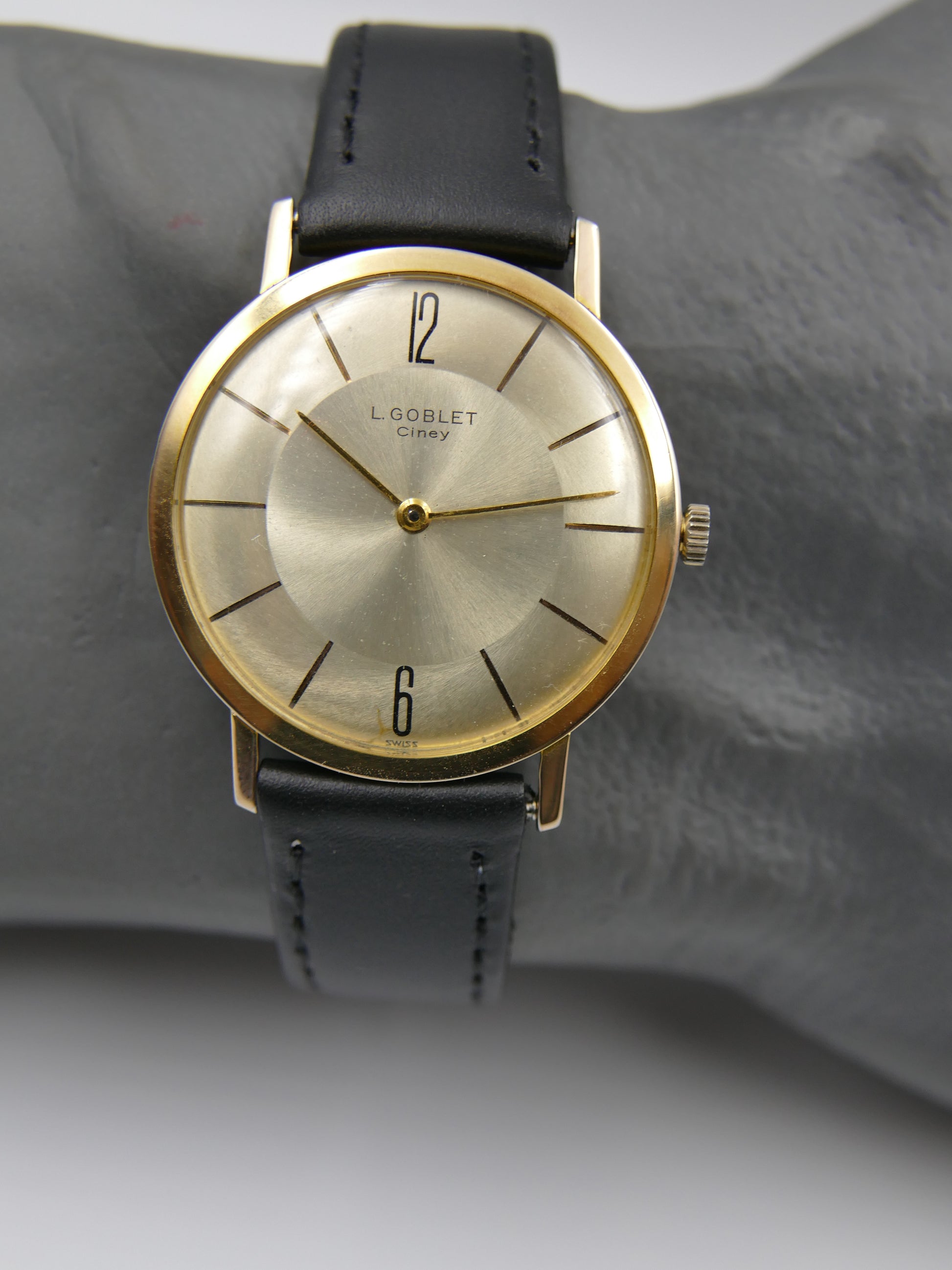 This is a swiss made dress watch, featuring a slim gold-plated case and a refined silver sunburst dial with minimalist baton markers. It is powered by a reliable Peseux hand-wound movement, well-known for its accuracy and elegant thin profile. L. Goblet was a Belgian retailer based in Ciney, sourcing high-quality Swiss calibres and assembling discreet, classic timepieces. This example embodies the understated mid-century aesthetic, with clean lines, gold baton hands, and an ultra-thin profile.